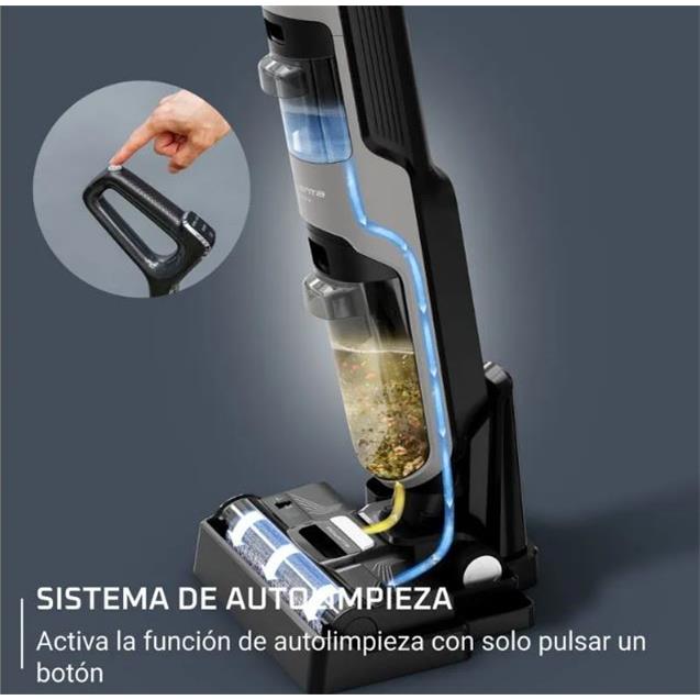 El depósito de agua desmontable alimenta el sistema de trapeado, que distribuye la humedad de forma equilibrada para dejar los pisos impecables y sin marcas. Además, su cabezal con luz LED mejora la visibilidad en rincones y debajo de muebles, mientras que su diseño ligero e inalámbrico garantiza libertad total de movimiento.