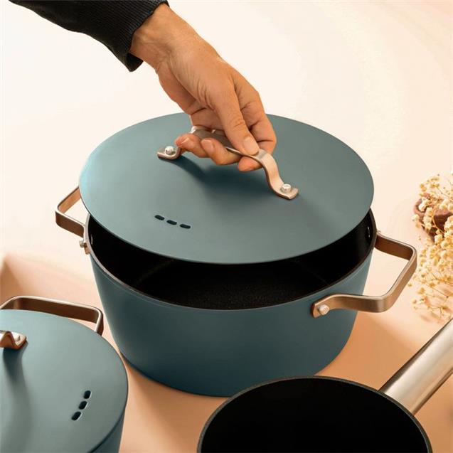 La cacerola San Ignacio Agros de 20 cm está fabricada en aluminio forjado, un material que asegura una excelente distribución del calor y una cocción pareja en todo tipo de preparaciones. Su acabado en color petróleo le da un aspecto moderno y elegante, apto para cocinas contemporáneas. Incluye tapa y asas metálicas resistentes que garantizan un agarre firme y seguro durante el uso. Diseñada para funcionar incluso en cocinas de inducción, ofrece versatilidad y rendimiento en el uso diario, permitiendo hervir, guisar o cocinar a fuego lento con resultados parejos y controlados.