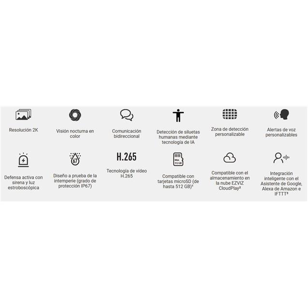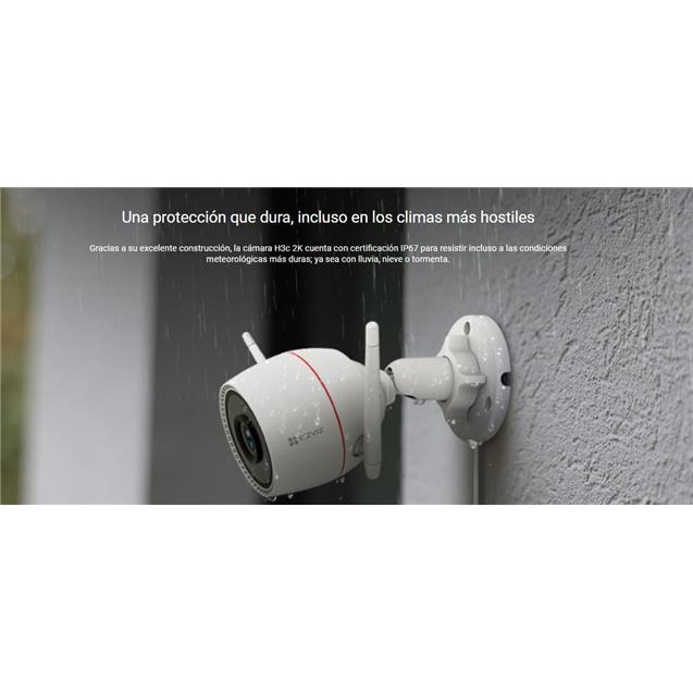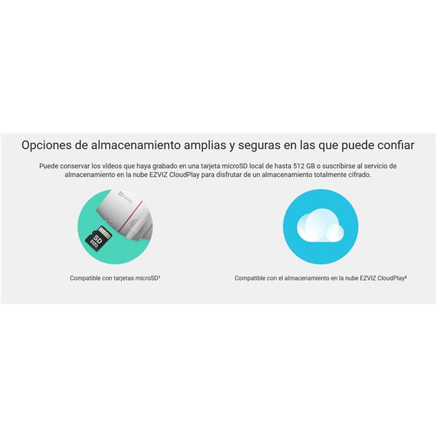 Ideal para exteriores, esta cámara tiene grado de protección IP67, lo que la hace resistente al agua y al polvo. Soporta temperaturas desde -30°C hasta 50°C, lo que garantiza funcionamiento seguro incluso en condiciones adversas.Permite almacenamiento local mediante tarjeta microSD de hasta 512 GB, y también es compatible con almacenamiento en la nube mediante EZVIZ CloudPlay.