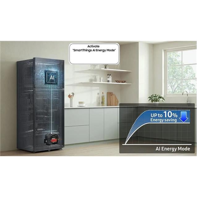 Incorpora el modo AI Energy Mode de SmartThings, que aprende tus hábitos, ajusta el consumo y el ciclo de descongelado, ayudando a ahorrar hasta un 10 % de energía según las condiciones de uso. El interior ofrece estantes de vidrio templado, bandejas múltiples, compartimientos para huevos, cajones para frutas/verduras, iluminación LED y un cajón Optimal Fresh+ que permite conservar ciertos alimentos delicados más tiempo gracias a su modo “Soft Freeze”. En cuanto al exterior, tiene un acabado negro elegante, puertas planas con manijas integradas, y un dispensador de agua libre de BPA, aportando estilo y funcionalidad.
