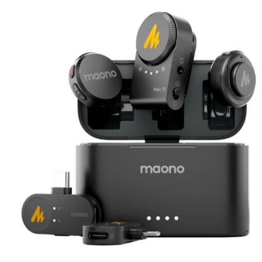 El kit incluye dos transmisores compactos con clip, un receptor triple compatible con USB-C, Lightning y 3.5 mm, y un estuche de carga inteligente que extiende la autonomía hasta 30 horas de uso total. Cada transmisor pesa apenas 9 g, resultando ligero y cómodo de usar durante largas jornadas. También incorpora funciones avanzadas como mute rápido, control desde la app Maono Link, y múltiples modos de uso para adaptarse a cámaras, smartphones o computadoras.
