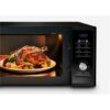 Mejorá la apariencia de tu cocina: Mejorá tu cocina con el elegante horno microondas MG23F3K3TAK, con un frente vidrio negro encerrado en un fino patrón a tono, con una pantalla de vidrio azul y una perilla detallada plateada.
