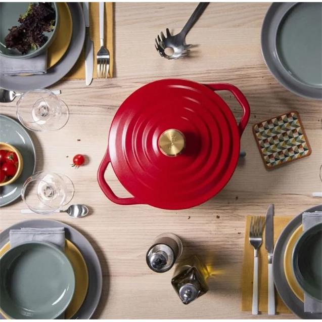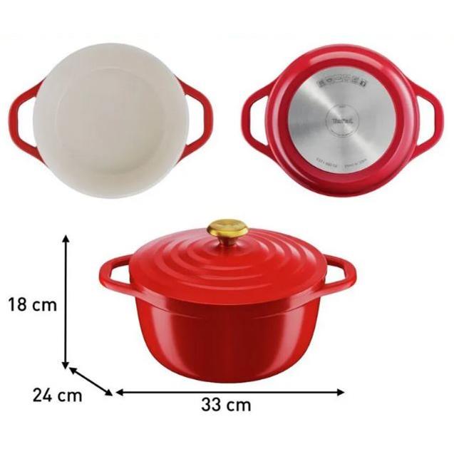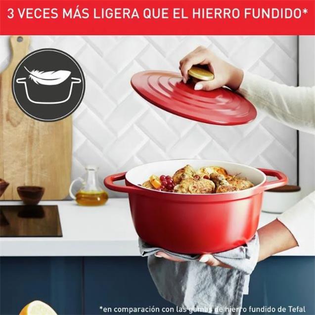 Compatible con todas las fuentes de calor (gas, eléctrica, vitrocerámica e inducción) y apta para horno hasta 250 °C, esta olla se adapta a todas tus recetas. Además, su color rojo intenso “Air Red” y su diseño moderno la convierten en una pieza decorativa que podés llevar directo a la mesa.