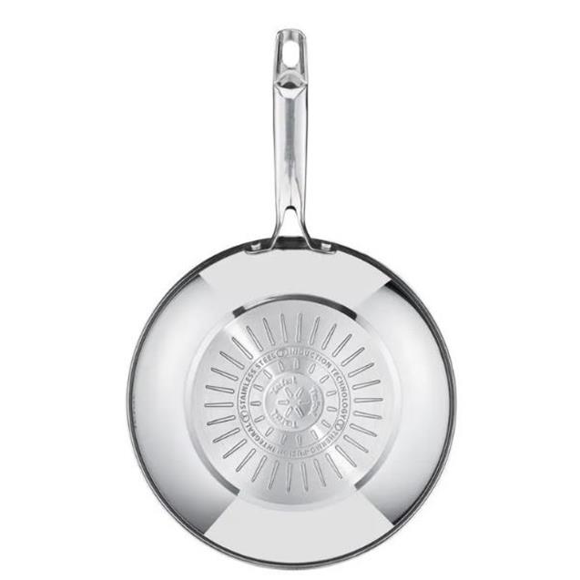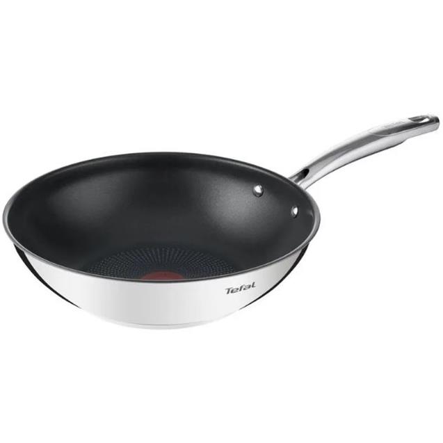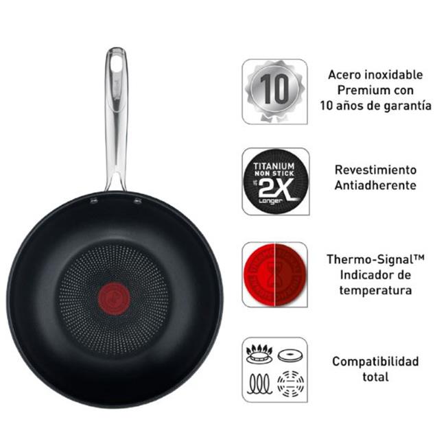 El Wok T-Fal Duetto 28 cm (modelo G7197956) combina diseño elegante, tecnología avanzada y durabilidad excepcional. Fabricado en acero inoxidable pulido de calidad premium, ofrece una cocción uniforme y resultados profesionales en cada preparación. Su interior cuenta con un revestimiento Titanium antiadherente, altamente resistente al rayado y al uso intensivo, que permite cocinar con menos aceite y sin que los alimentos se adhieran. Además, incorpora la exclusiva tecnología Thermo-Signal™, que cambia de color indicando la temperatura ideal para comenzar a cocinar, garantizando un sellado perfecto y sabores más intensos. La base Thermo-Fusion™ distribuye el calor de manera homogénea, optimizando la eficiencia energética y evitando zonas frías. Gracias a su compatibilidad con todas las fuentes de calor, incluyendo inducción, este wok es ideal para preparar salteados, verduras, carnes o recetas orientales con resultados increíbles.
